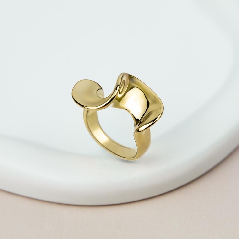 Стильное кольцо с плавными, волнообразными формами в сияющем золотом оттенке. Современный дизайн и зеркальная поверхность создают эффектный и элегантный акцент для любого образа.