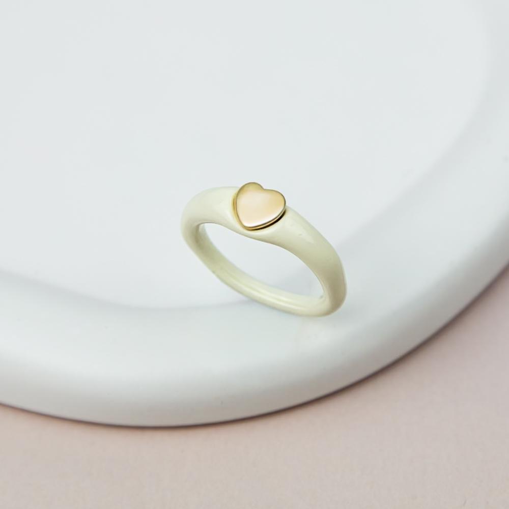 Нежное кольцо с эмалевым покрытием и изящной золотистой серединкой в форме сердца — идеальный мягкий акцент для повседневного образа.