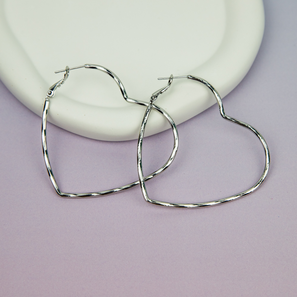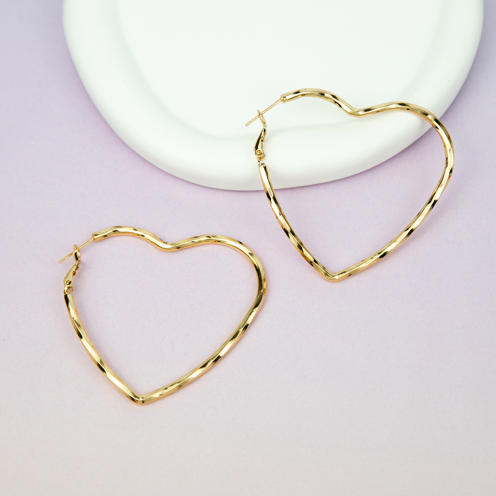 Эффектные серьги-кольца в форме сердца, выполненные из ювелирного сплава. Фактурная поверхность металла придает украшению оригинальный вид, а крупный размер делает их заметным акцентом в образе. Легкие и удобные в ношении, подойдут для создания стильного и смелого образа.
