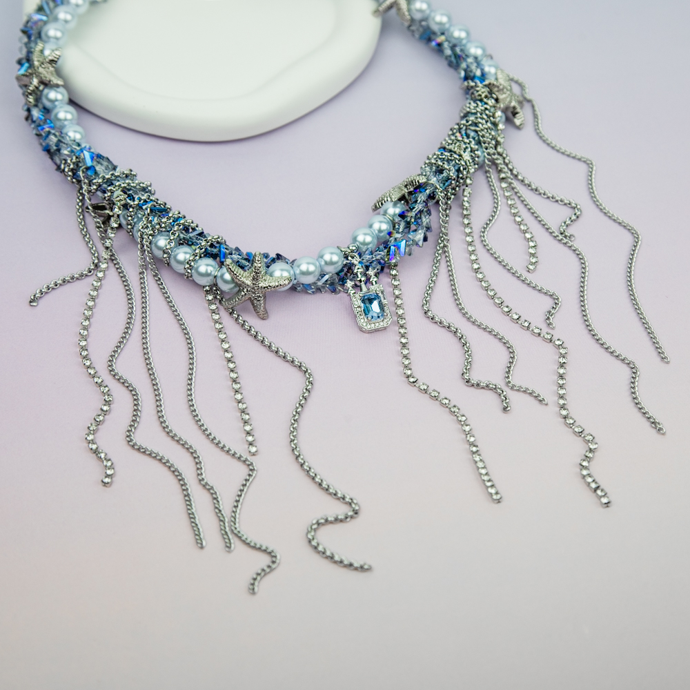 Роскошное колье в морском стиле, украшенное сверкающими кристаллами, искусственным жемчугом и подвесками в виде морских звезд. Нежные голубые оттенки и серебристые цепочки создают эффектное сочетание, напоминающее о морской глубине. Идеальный аксессуар для создания неповторимого и запоминающегося образа.