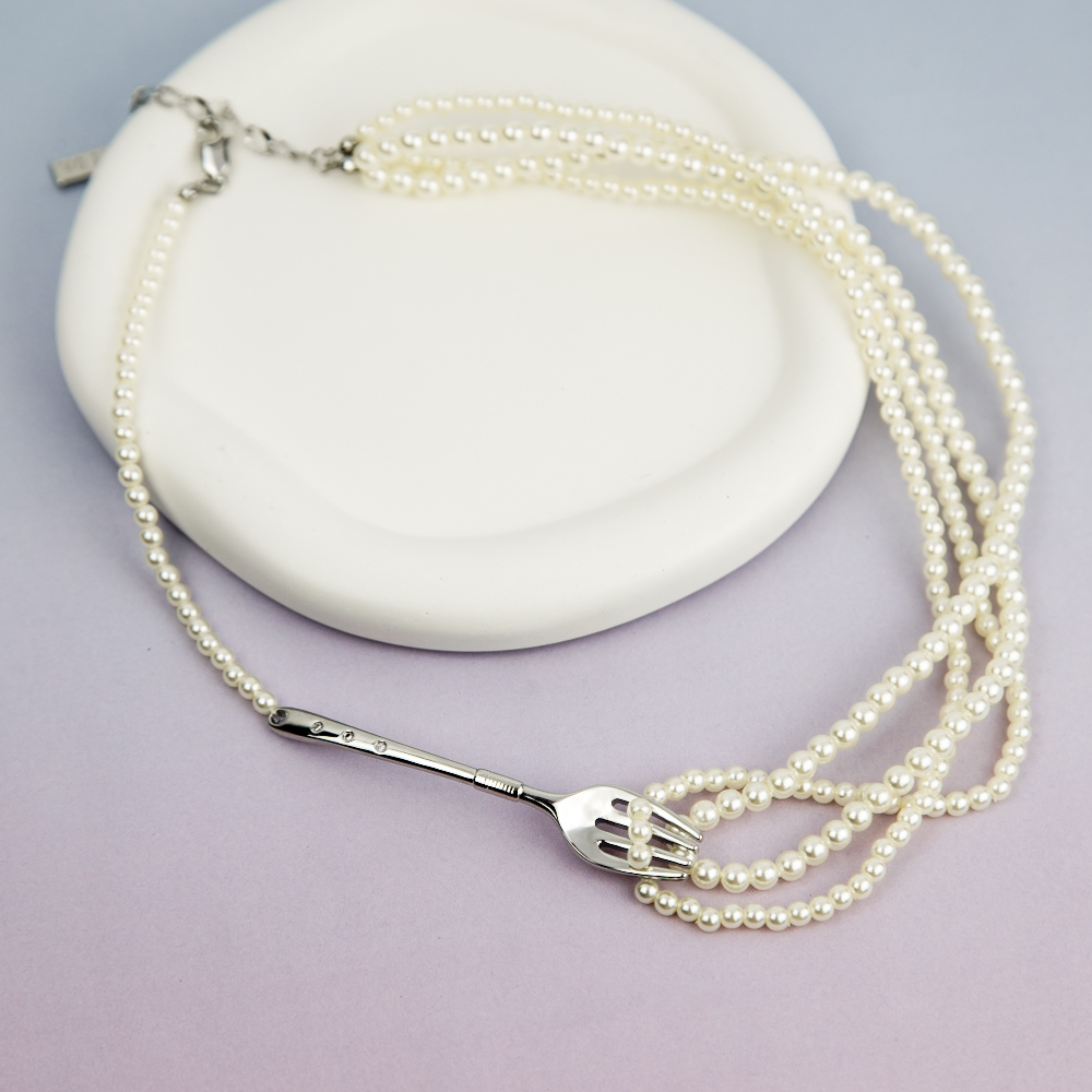Cмелый летний акцент для тех, кто любит сочетать классику с дерзкими деталями. Колье идеально подойдёт для тех, кто не боится экспериментировать и добавлять в образ нотку игривости. Многослойные нити искусственного жемчуга встречаются в центре с миниатюрной серебристой вилкой - ироничным и стильным символом самовыражения. Лёгкий блеск жемчуга и холодный металл создают необычный дуэт, который точно не останется незамеченным.