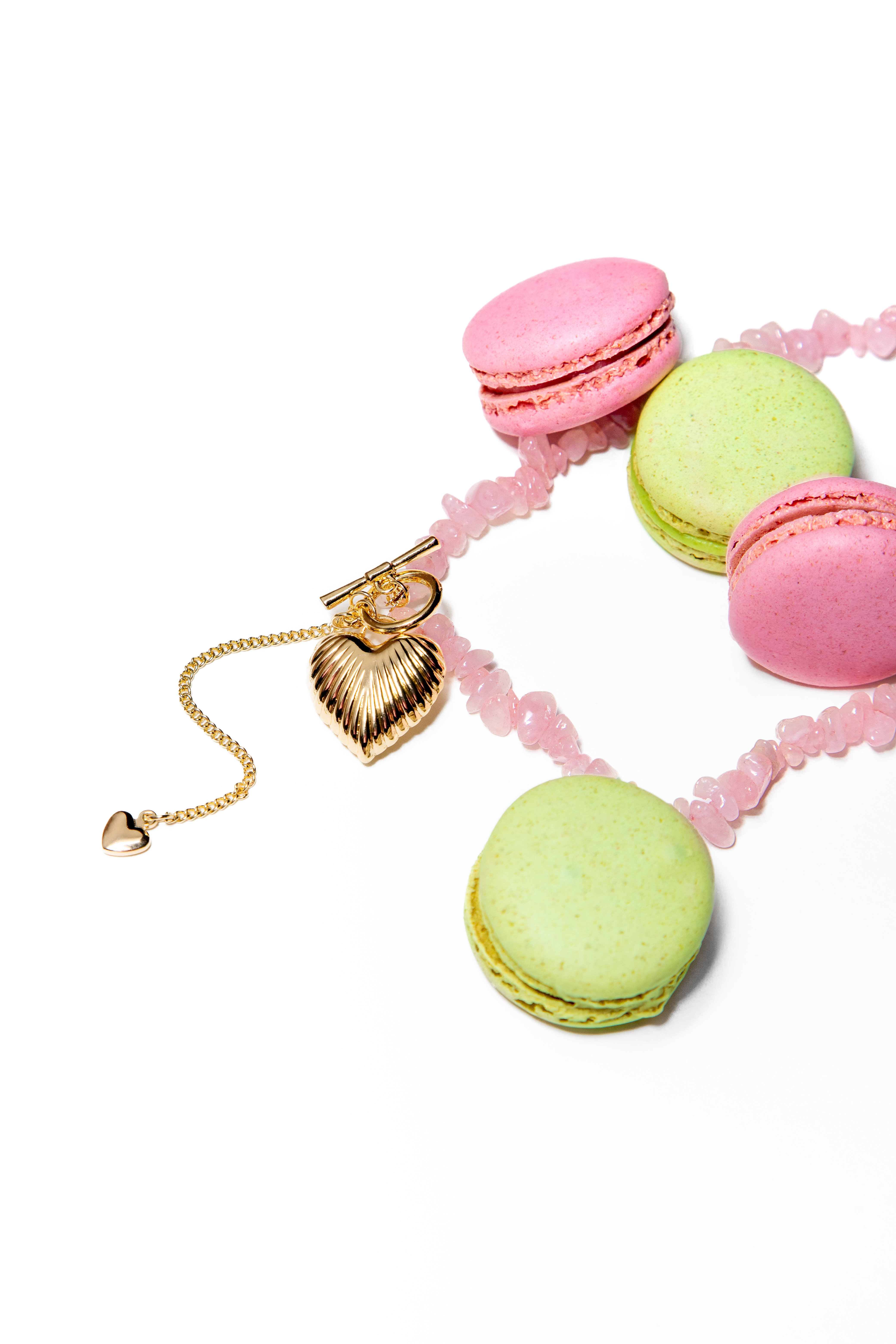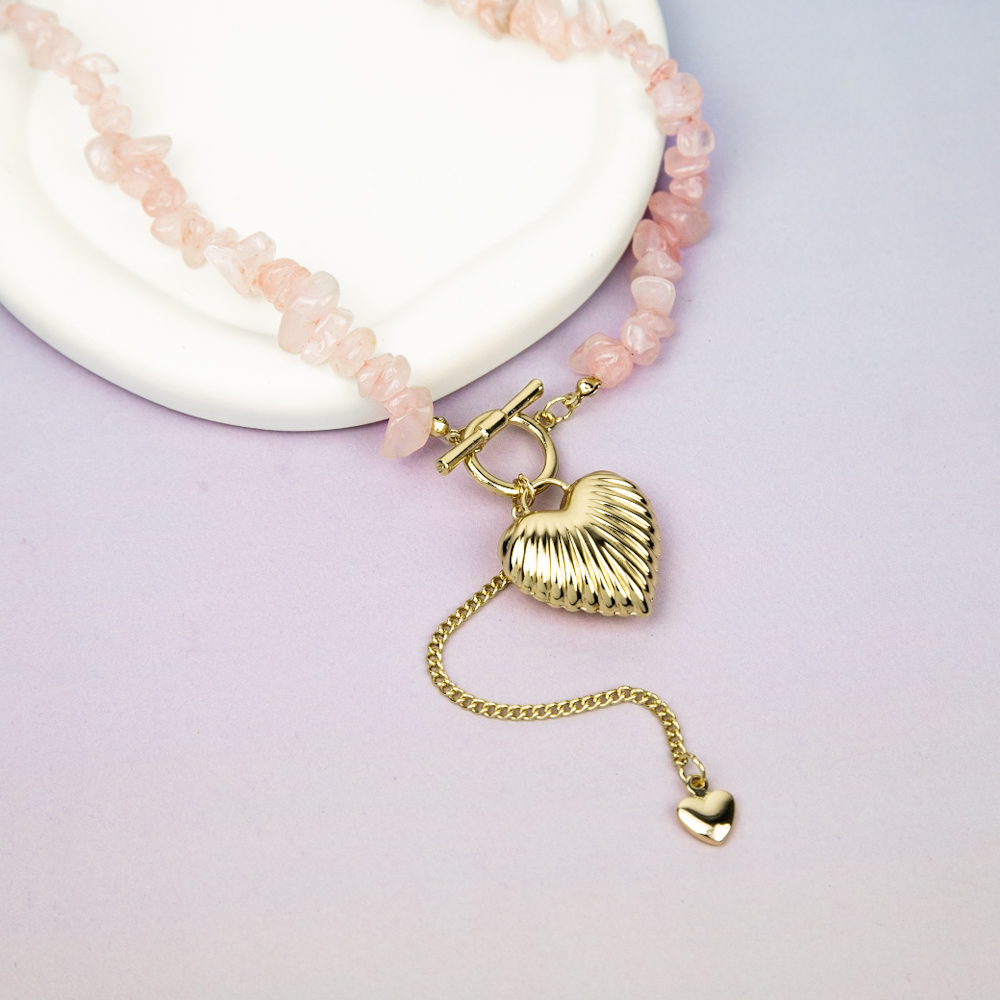 Это изящное колье сочетает в себе нежные розовые кристаллы, напоминающие кораллы, и золотистую подвеску в форме сердца, символизирующую любовь и тепло. Его дизайн навеян атмосферой морского отпуска — теплым солнечным светом, мягким шелестом волн и яркими красками коралловых рифов. Розовые кристаллы создают ощущение легкости и свежести, словно капли морской воды, а золотистая подвеска добавляет изысканности и гармонии. Такое украшение станет прекрасным напоминанием о беззаботных летних днях у моря и наполнит образ романтикой и светом отпускных воспоминаний.